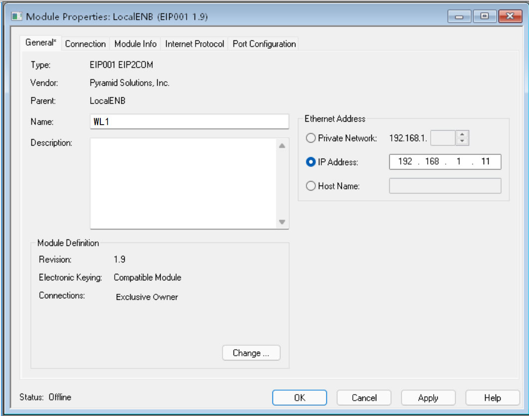 6、設(shè)置EtherNet/IP轉(zhuǎn)PROFINET網(wǎng)關(guān)的設(shè)備名稱和IP地址,本例為WL1, IP192.168.1.11(此處設(shè)備名稱可隨意寫(xiě),網(wǎng)關(guān)在EtherNet端不需要設(shè)置設(shè)備名稱);
