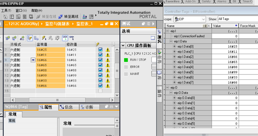 16、進(jìn)行下載,下載成功后將EtherNet/IP轉(zhuǎn)PROFINET網(wǎng)關(guān)模塊重新上電即可.重新上電后EtherNet/IP轉(zhuǎn)PROFINET網(wǎng)關(guān)的PWR和SYS燈常亮表示電源及系統(tǒng)正常,OK燈常亮表示與PROFINET主站通訊正常。Run常亮表示EtherNET/IP主站通訊正常,ERR燈閃爍表示與EtherNET/IP通訊中斷。監(jiān)控兩邊數(shù)值顯示數(shù)據(jù)交換成功;