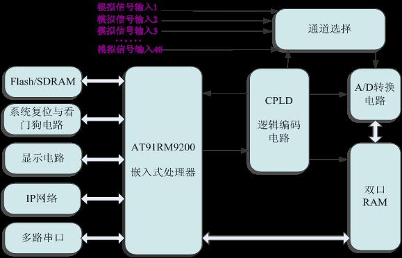 在系統(tǒng)運(yùn)行過(guò)程中,CPU發(fā)控制信號(hào)給CPLD,利用CPLD編程的靈活性來(lái)控制48路ADC的啟動(dòng)和停止,即達(dá)到動(dòng)態(tài)地選擇采樣通道地目的。ADC轉(zhuǎn)換電路將采樣信號(hào)由FIFO緩沖后送入ARM處理器,進(jìn)行數(shù)據(jù)處理并將結(jié)果傳輸?shù)缴衔粰C(jī)。